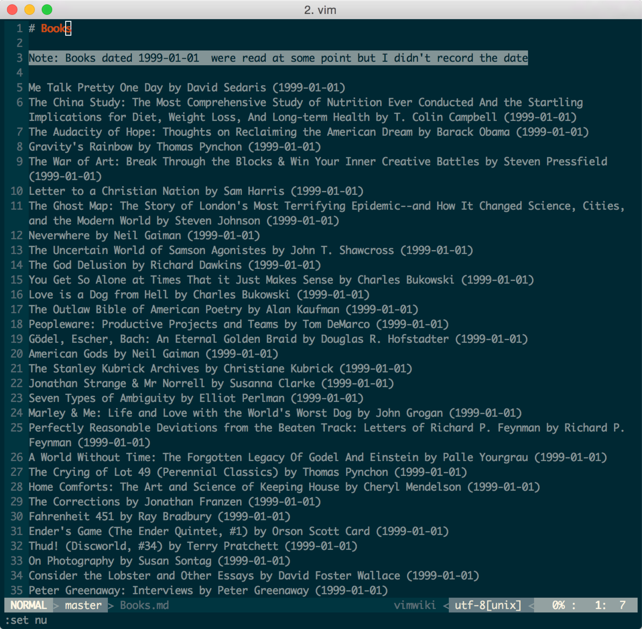 The problem is that I’ve once again gone all-in on keeping things in text files. I’d been successfully avoided changing the way my book list is managed yet again until I read Jamie Todd Rubin’s post titled “Joys of a Text-Based Reading List”. That did it. I exported everything out of Tinderbox and moved it into a single text file. It’s not nearly as fancy this way, but I can easily manipulate and query it using the same tools I use for nearly everything else. Jamie’s post lists a number of neat ways of doing that.