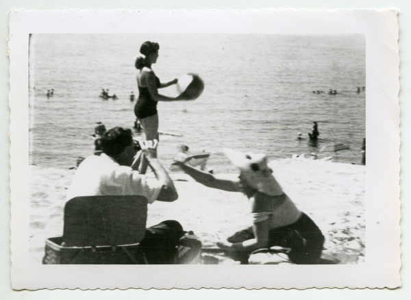 The woman with the beach ball is playing catch with another woman who is out of frame. The man watches the second woman until his wife has had enough and snatches the binoculars away from him. At least that’s how I imagine it.