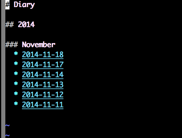 There’s also a nifty Diary feature. Pressing ,w,w opens or creates a new diary page for the current day. ,wi brings up an index of Diary pages: