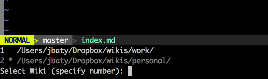 Vimwiki supports multiple wikis. I’ve created two wikis, “work” and “personal”. Each becomes its own folder. To switch between them it’s just ,ws and then enter the number of the blog;