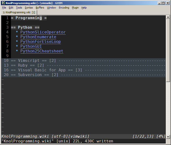 Anyway, there’s a lot more to Vimwiki. Just do :help vimwiki and lose yourself.
