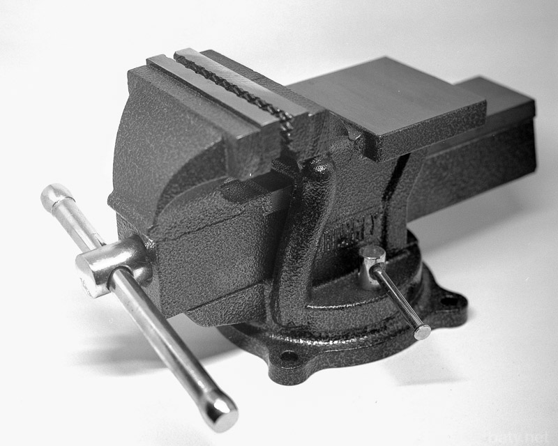 There’s something wrong with my process or my equipment. I took this photo of a bench vise today using the Speed Graphic. It was lit using the Foldio, shot on HP5+ and processed in R5 Monobath from New55