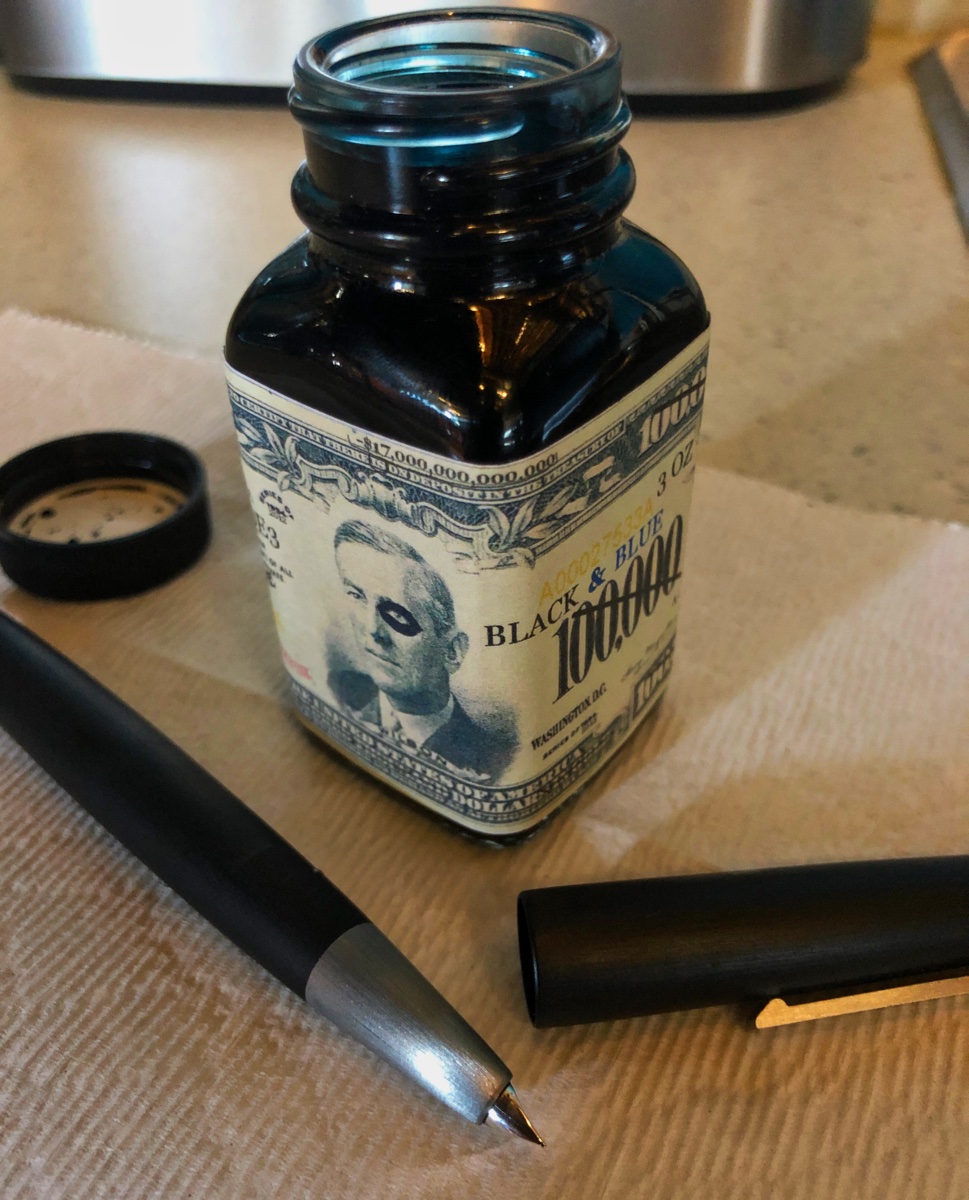 I finally ran out of ink in the Lamy 2000. Refilled it with Noodler’s Bernanke black & blue “Q-E’ternity”. It dries so fast! Great for left-handed people like me.