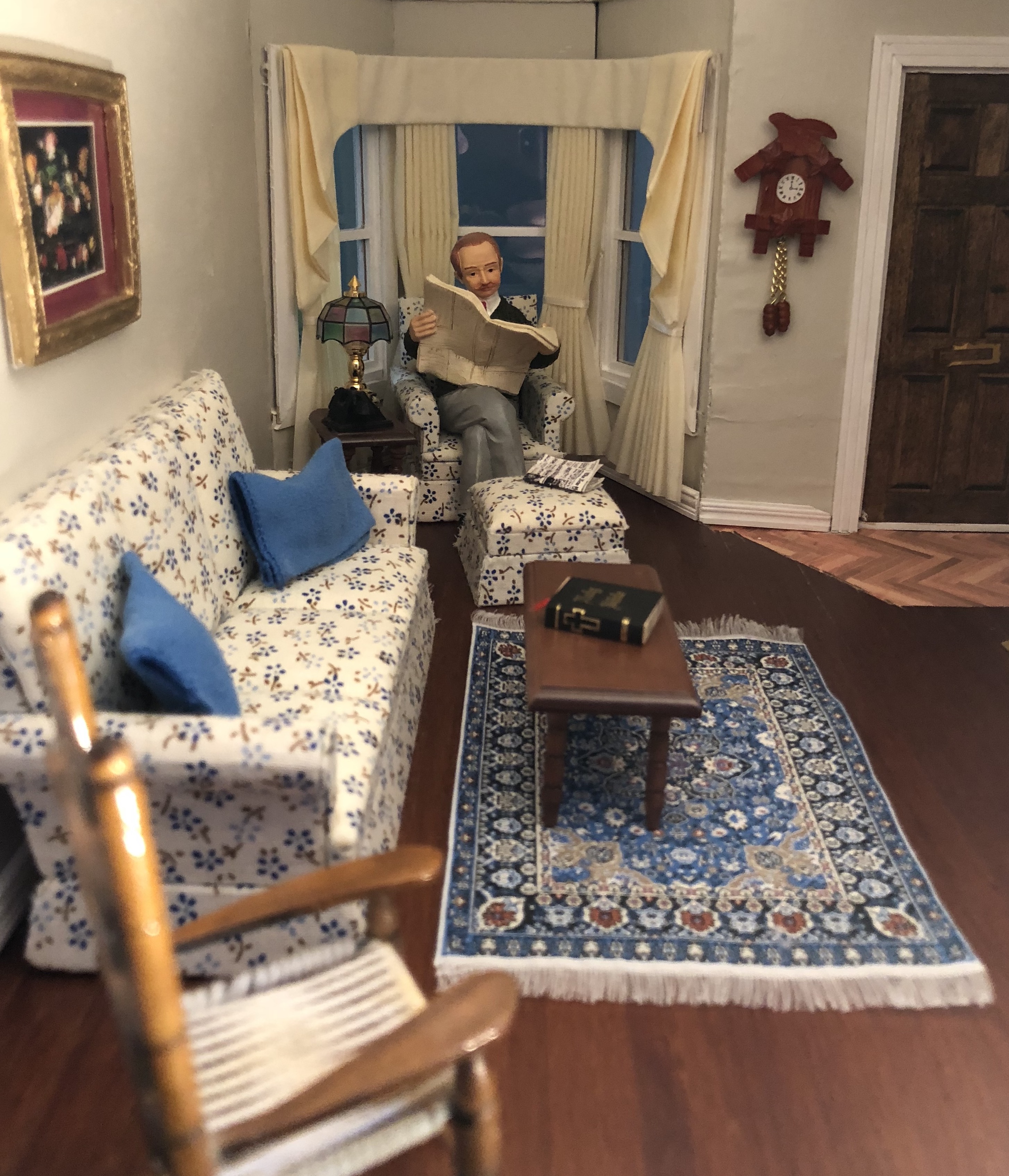 My mom loves tinkering with her dollhouse. The gentleman reading a newspaper showed up recently.