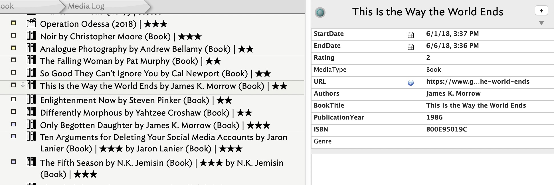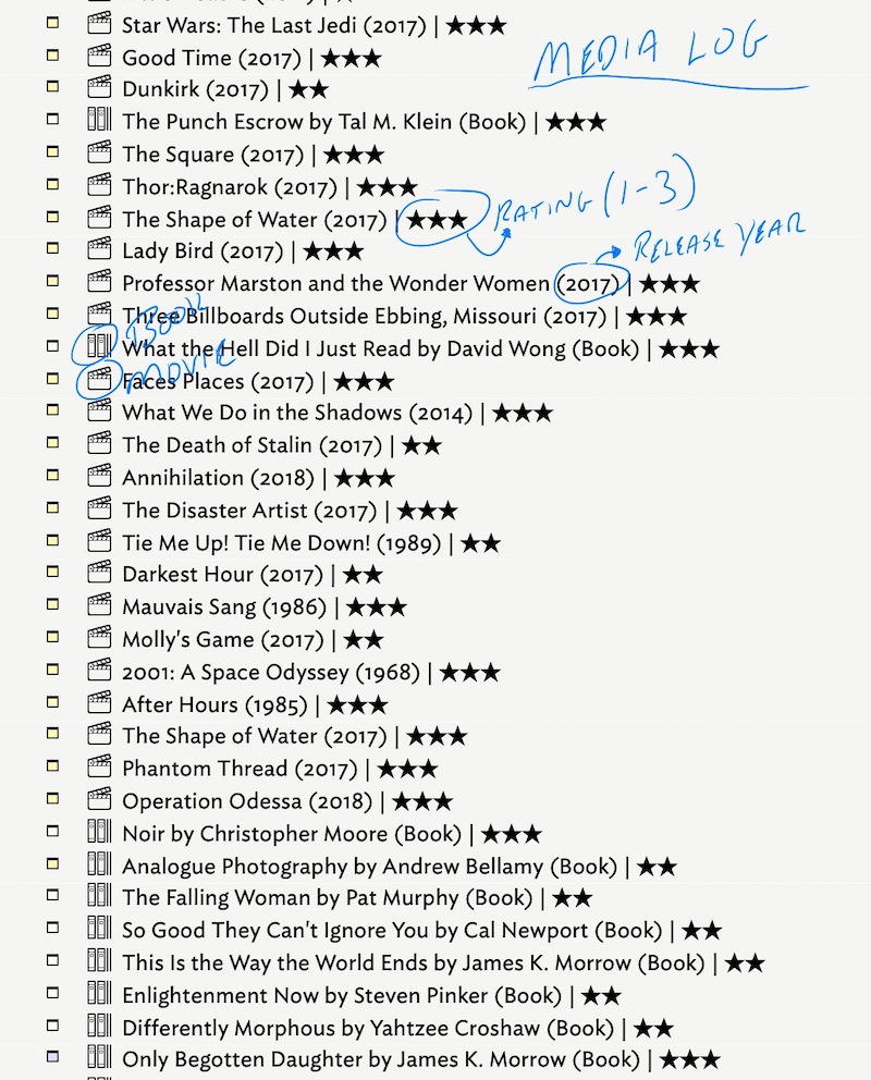 Tinderbox lets me add any metadata I want to notes. For example, the Media Log contains the following: