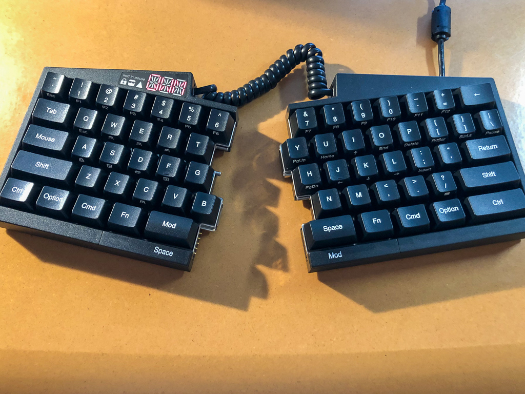 I thought I’d try a 60%, split layout keyboard, so I ordered an Ultimate Hacking Keyboard