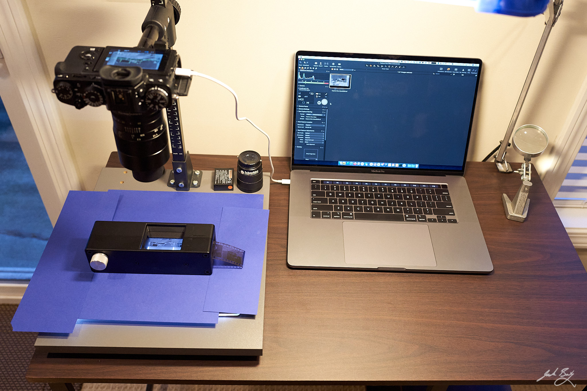 The other components of this new scanning workflow are a small lightbox, a Fuji X-T3 with the 7Artisans 60mm Macro lens, a copy stand, and Capture One Pro.
